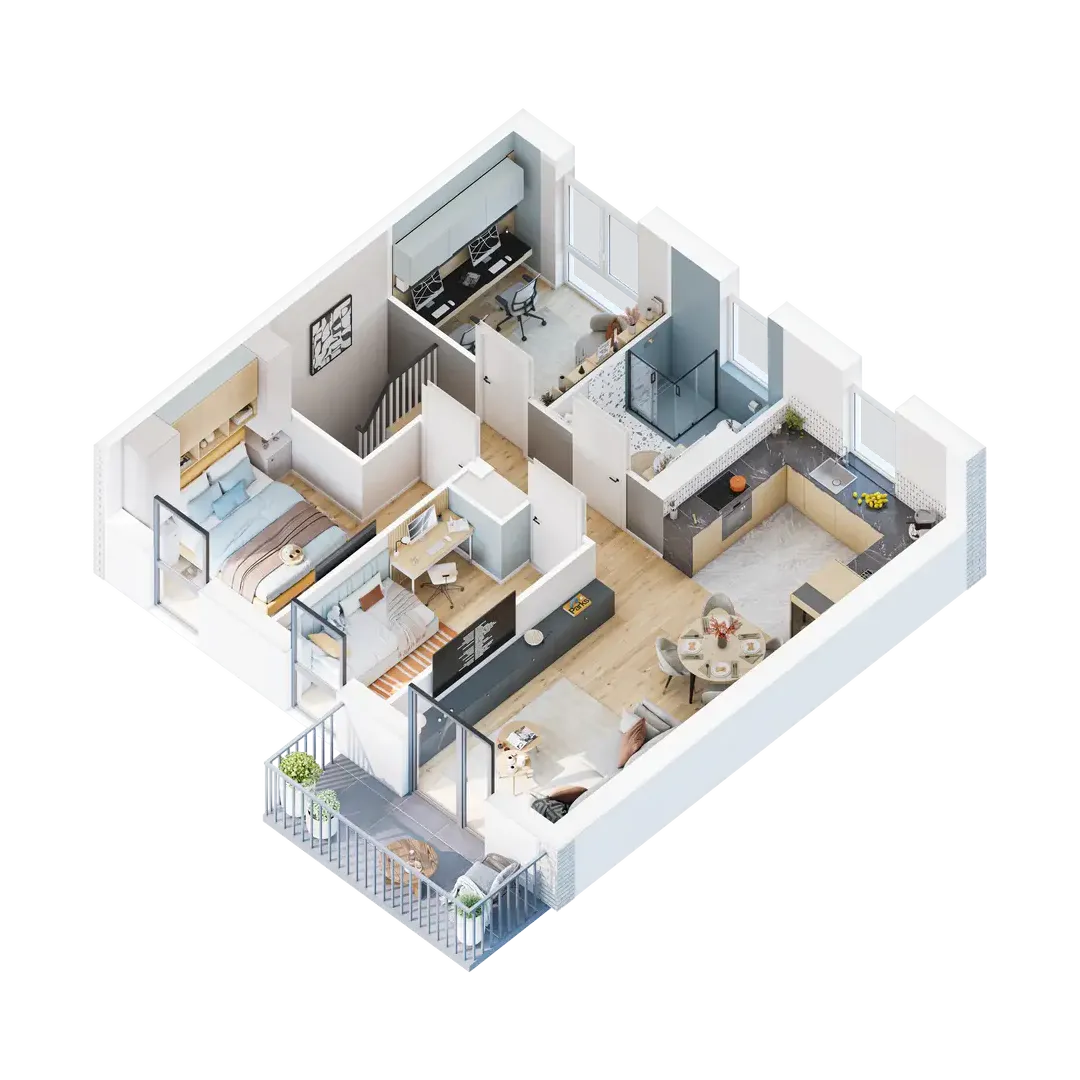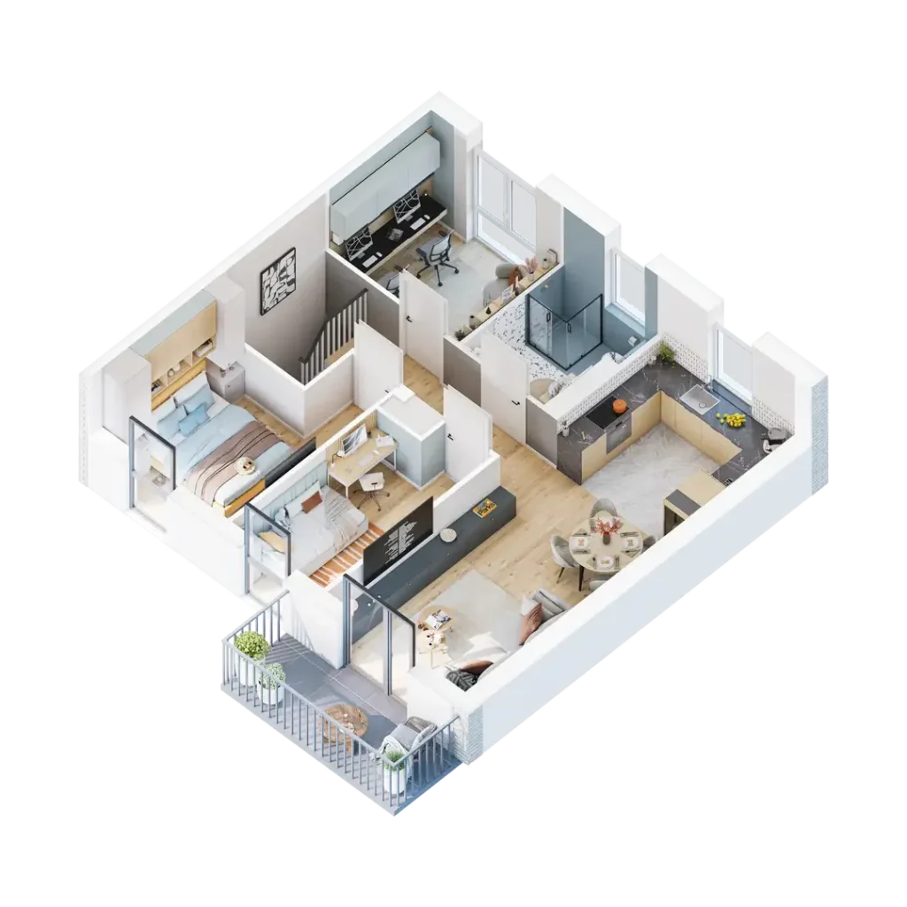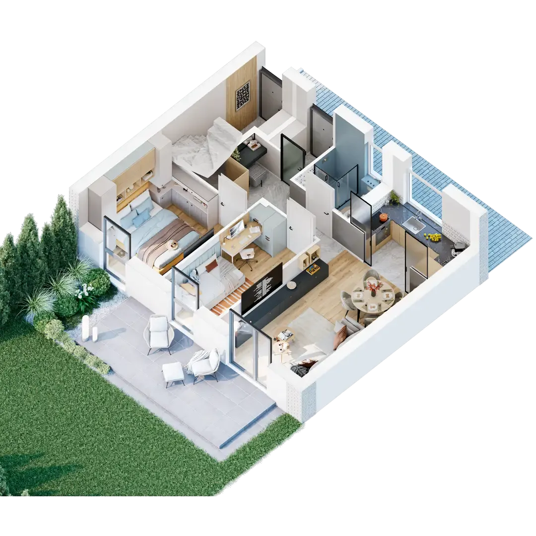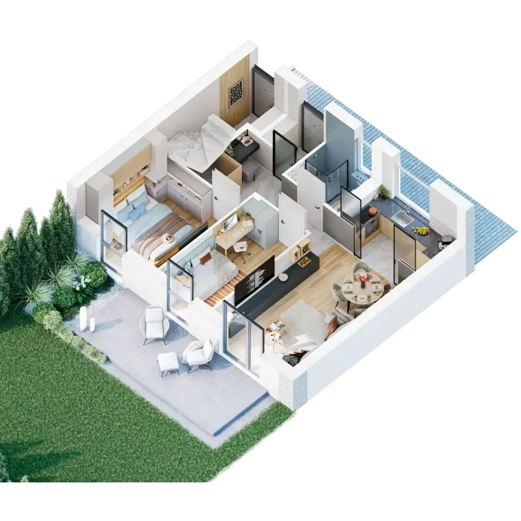 W ofercie znajdują się mieszkania o powierzchni 49 m² oraz 62 m², zaprojektowane w sposób maksymalnie funkcjonalny. Każdy lokal składa się z: dwóch ustawnych sypialni, przestronnego salonu z aneksem kuchennym, łazienki, oraz praktycznej garderoby.